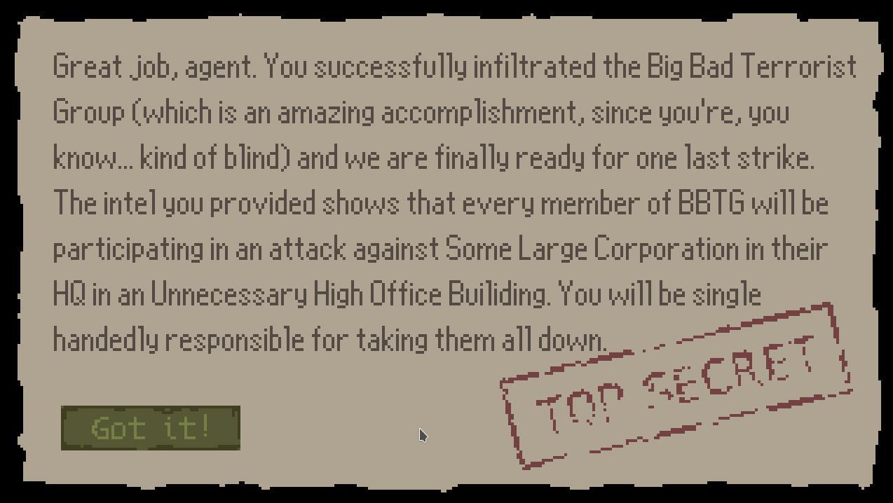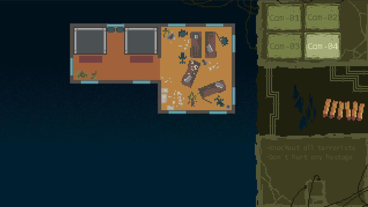 Короткая и глупая игра об агенте, проникающем в офисное здание и уничтожающем террористов. Поскольку агент слеп, ему приходится полагаться на информацию от 4 специалистов по связи, каждый со своей камерой и набором информации, но наш агент может использовать ТОЛЬКО ОДНУ часть этой информации одновременно. Таким образом, вы либо будете знать, где вы находитесь, где находятся враги, где находятся заложники, либо расположение офиса.