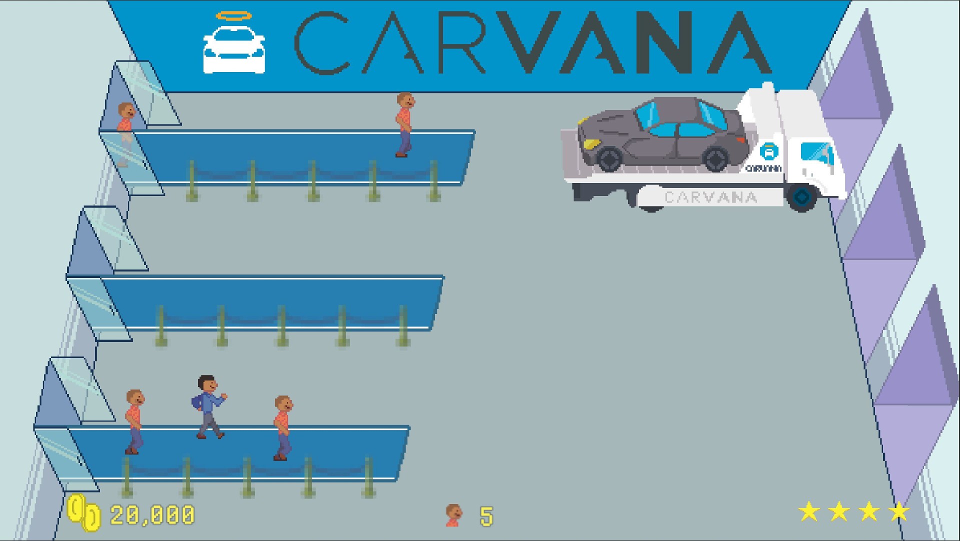 Загрузите свой перевозчик автомобилем клиента и перемещайтесь между полосами движения, доставляя их до того, как они достигнут конца ковра. Клиент без машины обязательно оставит вам плохой отзыв. Время от времени клиент принимает решение вернуть купленный автомобиль, обязательно вернуть его в гараж или погрузить на пустой тягач; остерегайтесь столкновений, которые произойдут, когда возвращающийся автомобиль встретится с полным погрузчиком или с другой доставкой. Выживите на десяти уровнях, и вы поможете Carvana достичь новых высот и даже больше!