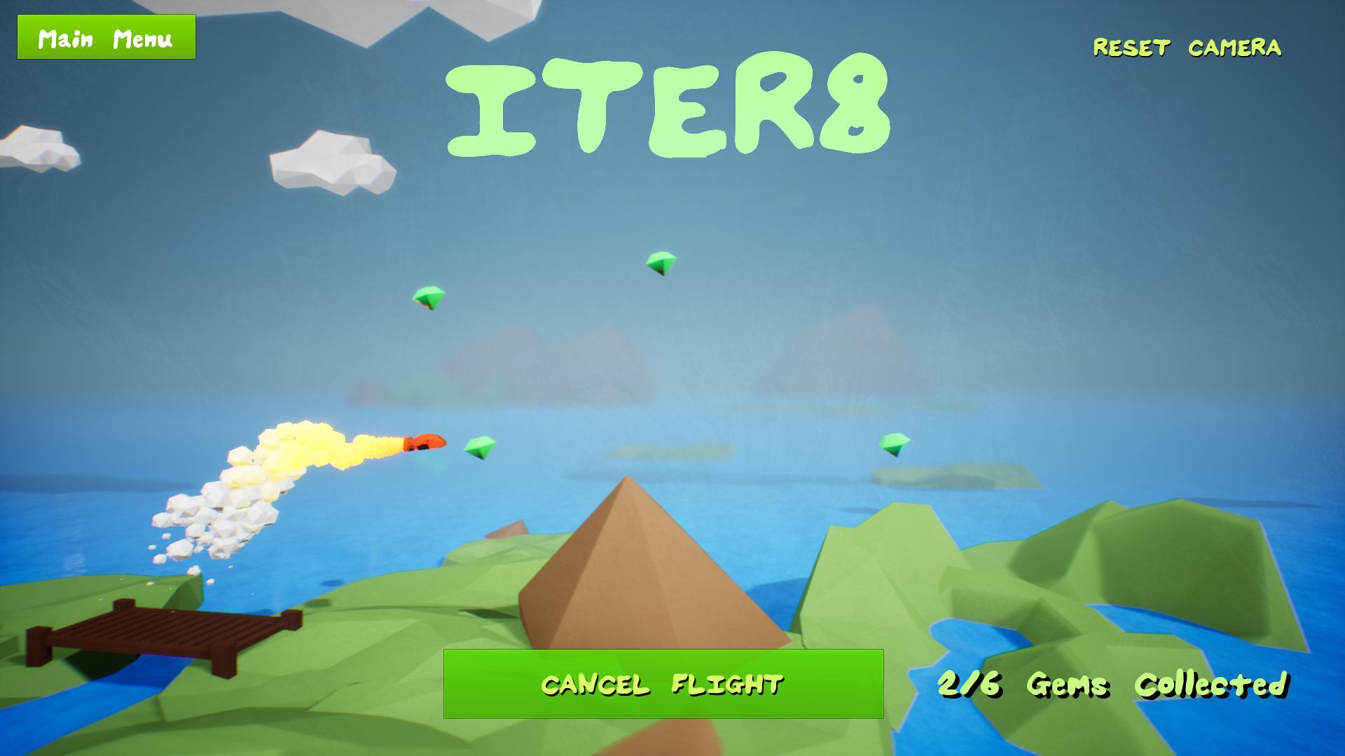 ITER8 (или "итерация") был создан для игрового джема "Сделай это важным". Вы должны собрать все драгоценные камни на каждом уровне, но для этого вы можете совершить только один короткий путь полета (так что считайте его!), Который зациклится навсегда. Уровни увеличиваются в сложности. Первые 8 уровней происходят в низкополигональной земной среде, последние 8 уровней — в космосе.