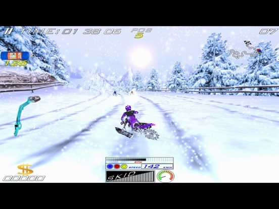 Соревнуйтесь с лучшими гонщиками на сноубайке на разных трассах!
