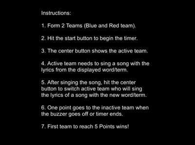 <р>1. Сформируйте 2 команды (Синюю и Красную команду). <р>2. Нажмите кнопку «Пуск», чтобы запустить таймер. <р>3. Центральная кнопка показывает активную команду. <р>4. Активной команде необходимо спеть песню, текст которой соответствует отображаемому слову/термину. <р>5. После исполнения песни нажмите центральную кнопку, чтобы переключить активную команду, которая будет петь текст песни с новым словом/термином. <р>6. Одно очко достаётся неактивной команде, когда звучит зуммер или заканчивается таймер. <р>7. Побеждает первая команда, набравшая 5 очков!