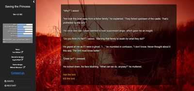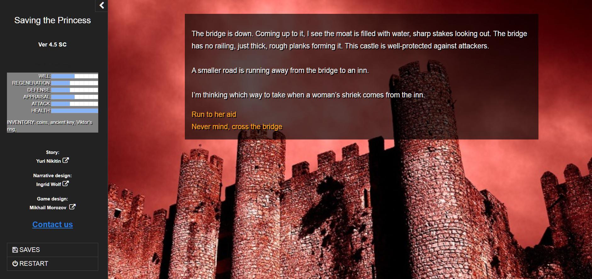 <р>Спасение принцессы — текстовая приключенческая игра, разработанная по мотивам рассказа популярного украинского писателя. До недавнего времени эта игра была доступна только на русском языке, но теперь мы перевели ее на английский! Исходную версию можно найти здесь: https://ingridwolf.itch.io/saveprincess1