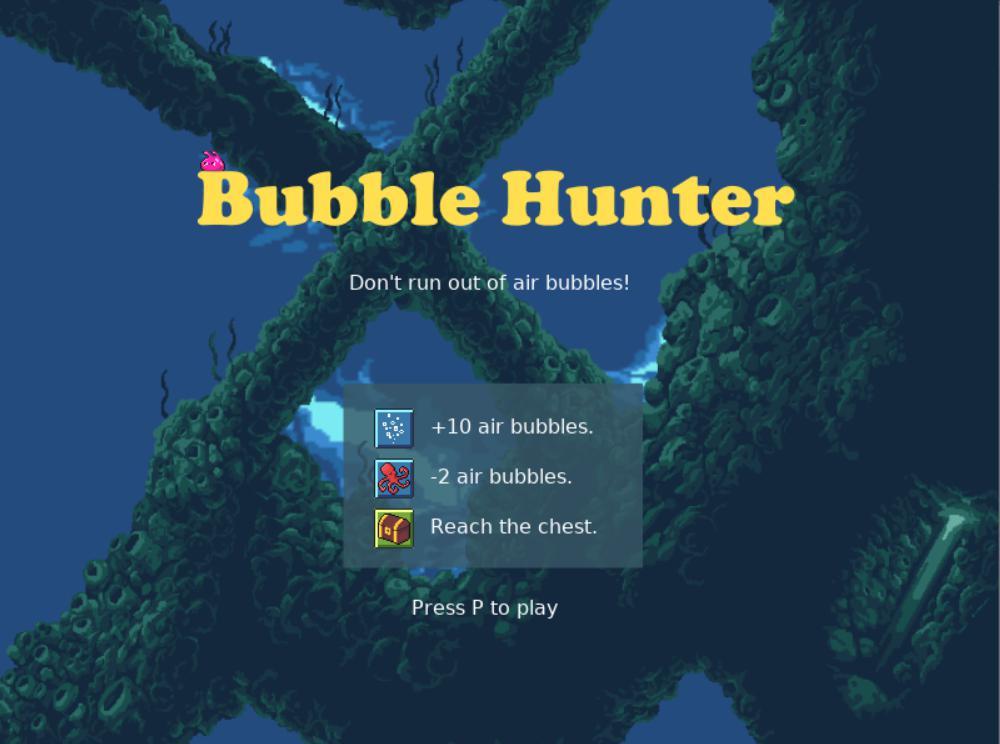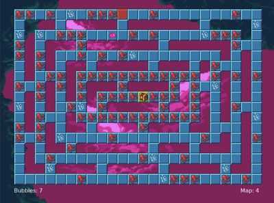 Это игра-головоломка-лабиринт. Вы начинаете с 10 пузырьков воздуха. Каждый раз, когда вы двигаетесь, вы теряете один пузырь. Если вы наступите на пузыри, вы получите десять новых пузырей. Если вы наступите на осьминога, вы потеряете 2 пузыря. Постарайтесь дотянуться до сундука, не закончив пузырьки воздуха.