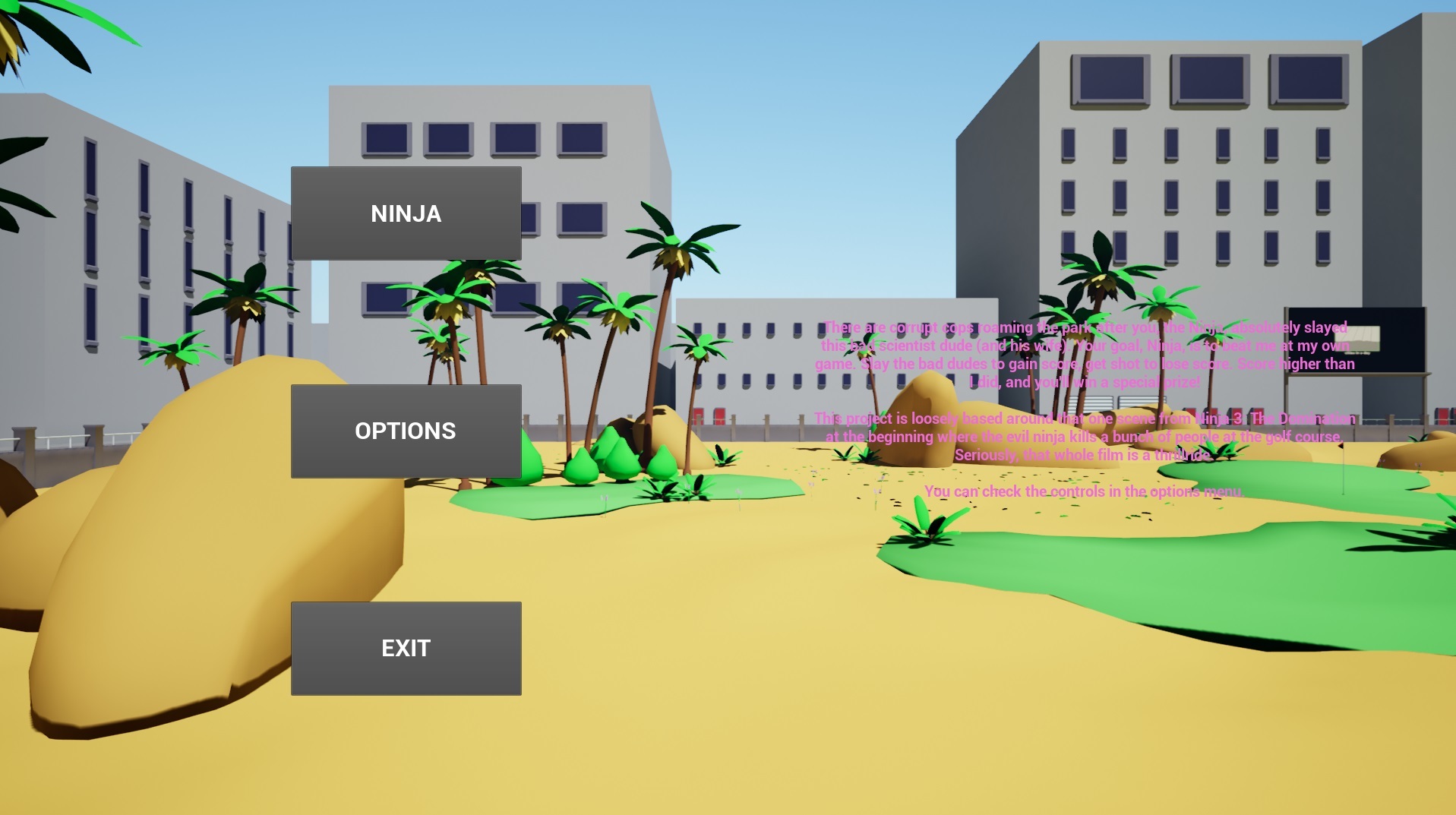Это просто игра, в которой вы бегаете по парку в роли ниндзя, рубя плохих парней катаной или сюрикенами. Вдохновлен той сценой из Ninja 3: The Domination, где ниндзя просто убивает всех на поле для гольфа без всякой видимой причины.