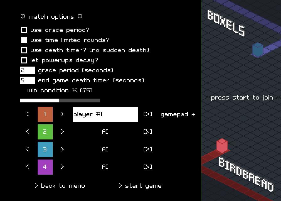 Boxels – это динамичная игра типа "игрок против игрока", вдохновленная классическими аркадными играми для 1–4 игроков.