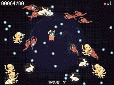 Помогите Теви сражаться с волной за волной опасных ёкай из легенды о зайце Инабы. соберите всех кроликов на экране, чтобы продвигать волны. стреляйте или уклоняйтесь от ёкай и их атак - и не позволяйте им первыми добраться до кроликов. здесь нет бомб и усилений, но вы получаете дополнительную жизнь каждые 60 000 очков.