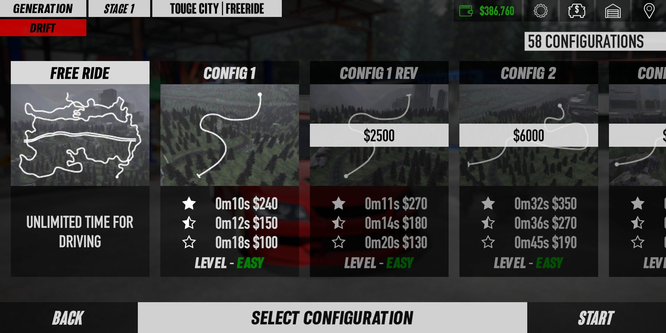 Каждый автомобиль имеет этапы "дрифт" и "гонки", очки заноса зависят от максимальной скорости автомобиля и максимального угла заноса: чем больше скорость, тем больше угол - так можно получить больше очков за занос.