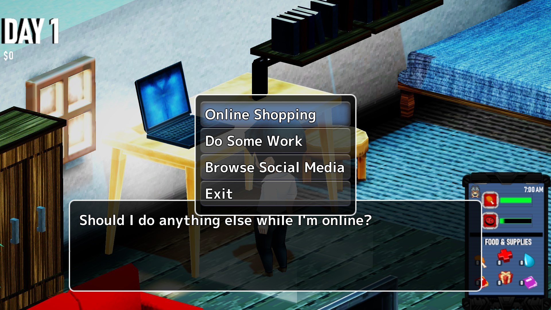 Isolation Story – это игра в стиле LIFE-SIM, в которой вы покупаете припасы, избегая людей , и управляйте своей БОЛЕЗНЬЮ с помощью нового ТЕЛЕФОНА GOV.