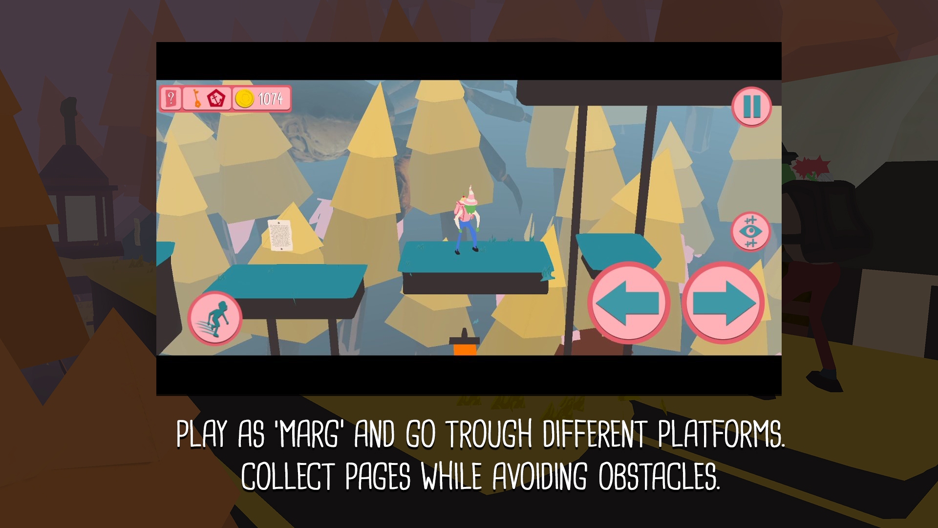 Наслаждайтесь основами жанра платформеров и знакомьтесь с милой предысторией, путешествуя с Марг. Собирайте золото, чтобы покупать сердца, чтобы продолжать играть, и разблокируйте различные косметические предметы, такие как шляпы, сумки и цветовые палитры для Марг.