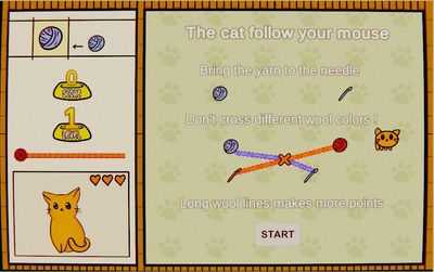 Вы управляете котом, которому нужно связать пряжу и спицы одного цвета, чтобы заработать очки. Но он никогда не должен переходить на шерсть другого цвета!
