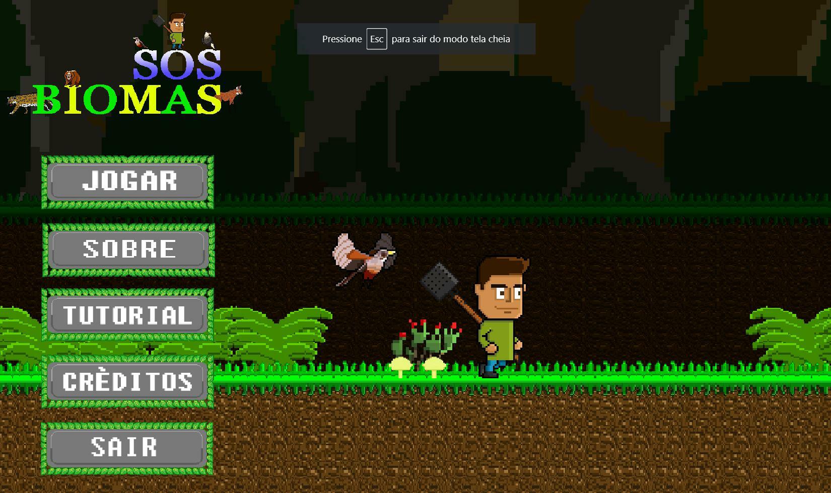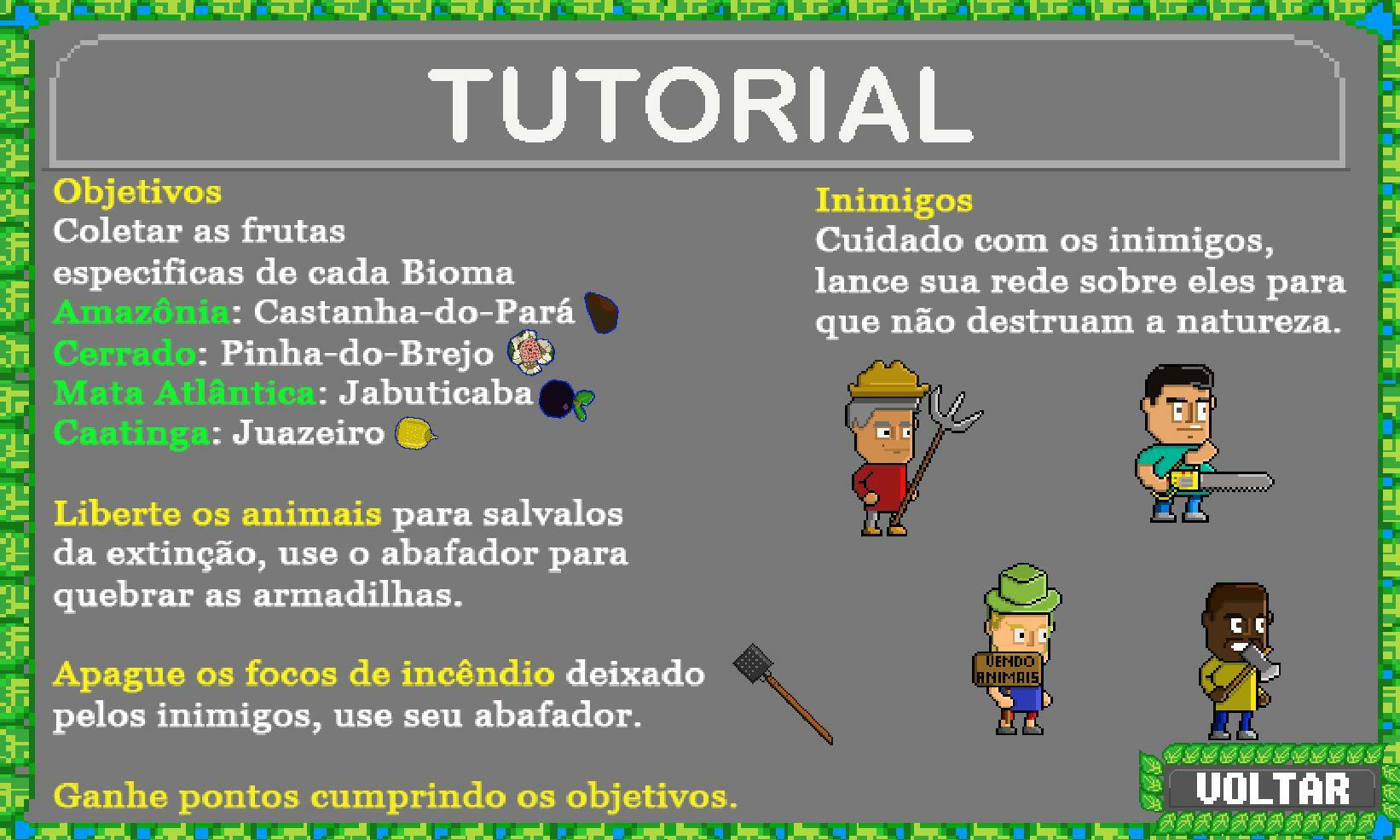 Jogo Educativo, de aventura com aprendizagem em biomas, extinção, desmatamento, queimadas e frutas especificas de cada bioma.