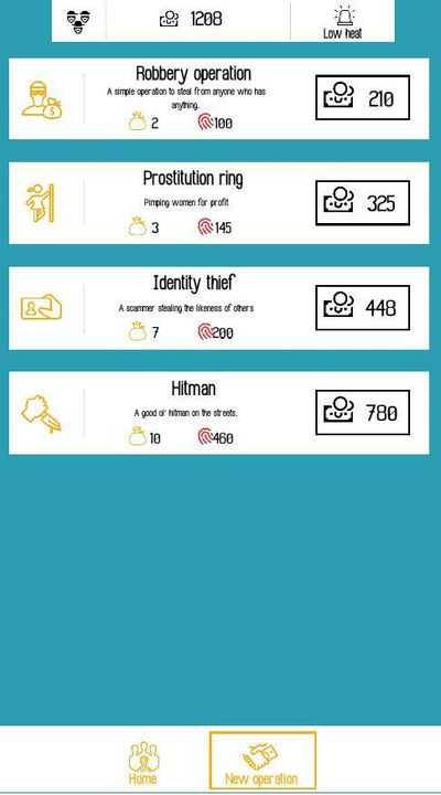 Мафиозный менеджмент, цель которого – заработать огромные суммы денег на организованной преступности. Ваша незаконная деятельность принесет вам деньги, пока вы будете планировать свой следующий план, но будьте утомлены, полиция держится у вас на хвосте и приближается. Когда они подходят слишком близко, вы должны приостановить свою незаконную деятельность, чтобы вас не арестовали, и возобновлять их всякий раз, когда полиция отступает. Но пока вы ждете, пока утихнет пыл полиции, полиция будет собирать доказательства прошлой деятельности, что может привести к аресту. это все зависит от вас, чтобы управлять! Разбогатей или умри, пытаясь.
