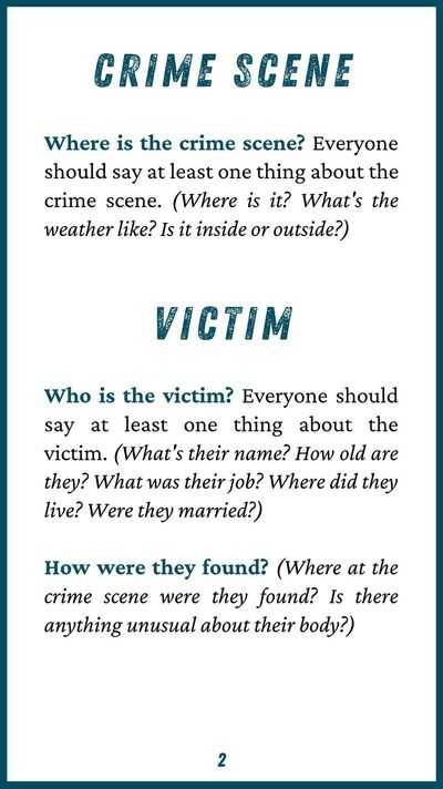 Каждый игрок представит подозреваемого, улики и информацию о жертве и месте преступления. Затем каждый игрок представит свою теорию о том, что произошло, используя любого подозреваемого и улики, которые он пожелает.