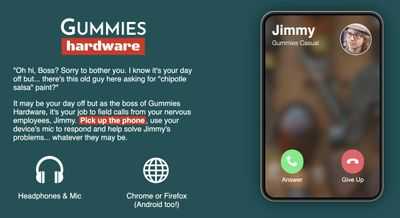 Возможно, сегодня у вас выходной, но Джимми, как руководитель Gummies Hardware, отвечает на звонки нервных сотрудников. Возьмите трубку, используйте микрофон устройства, чтобы ответить и помочь решить проблемы Джимми... какими бы они ни были.
