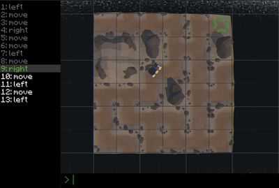 НОРМАЛЬНЫЙ: Вы просто вводите первую букву команды "l" для поворота налево, "r" для поворота направо и "m" для перемещения вперед на одну плитку.