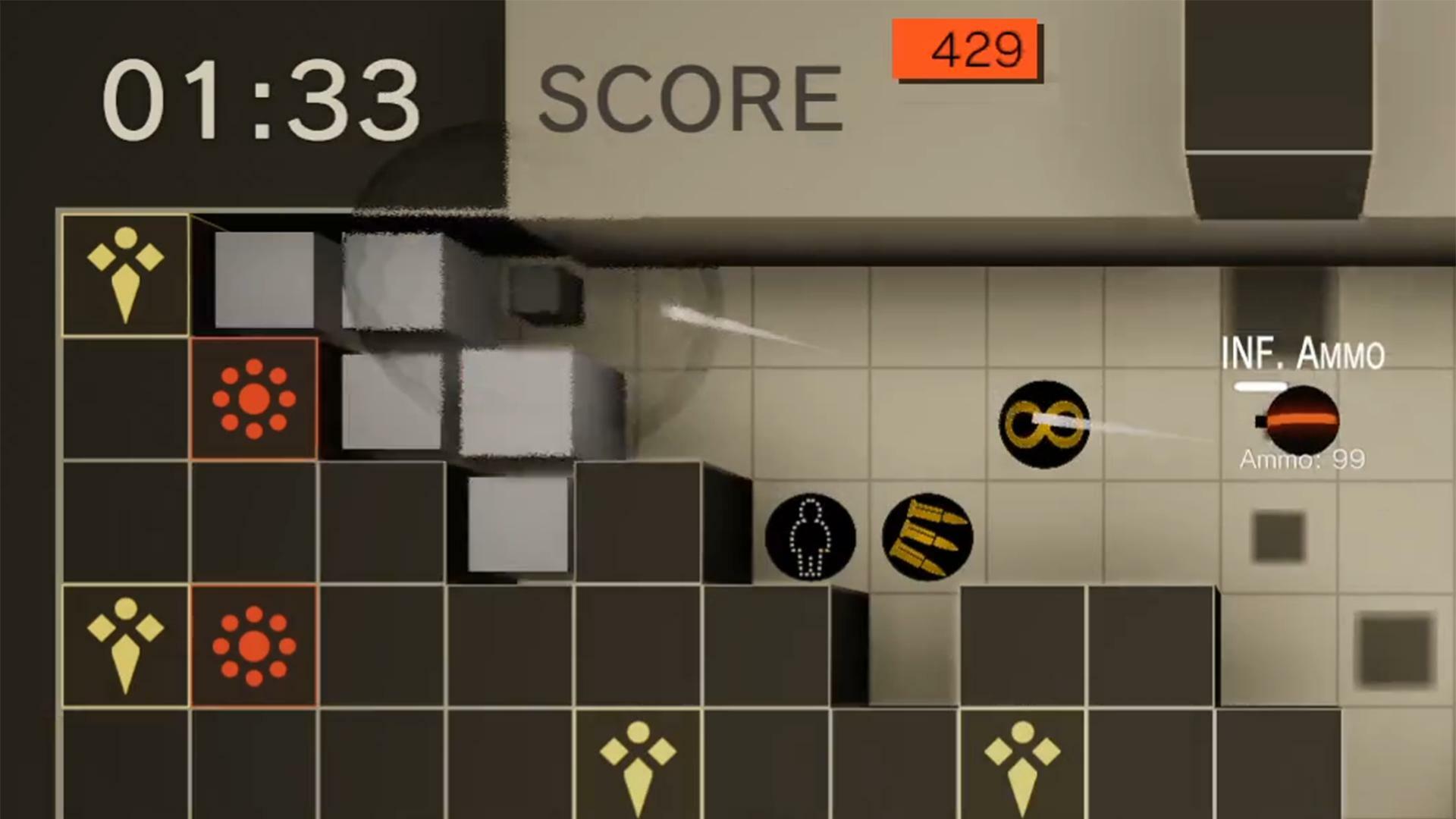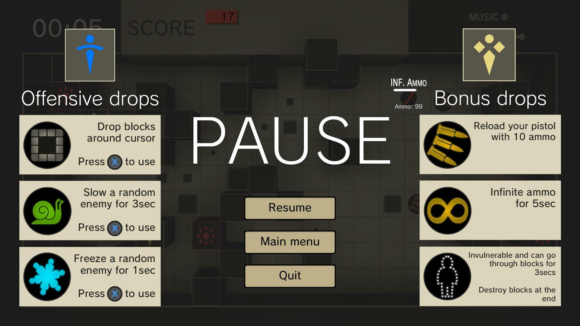 На вас падают блоки: избегайте их, иначе вы погибнете. Вы можете стрелять по блокам, чтобы освободить место. Если у вас кончились боеприпасы, используйте вместо этого атаку «подкат». Вы можете пополнить боезапас, собирая желтые блоки.
