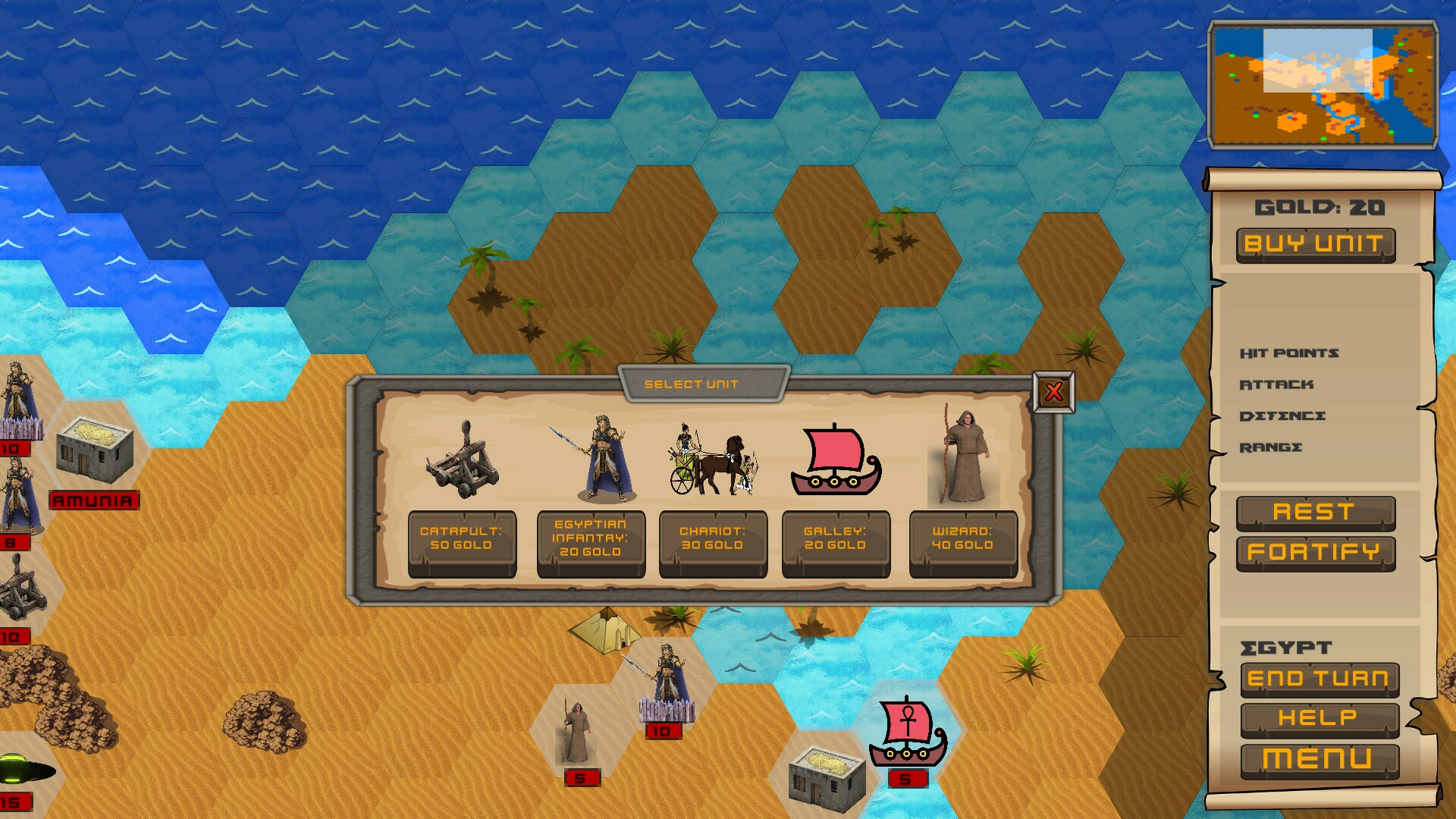 Egypt vs. Aliens – это пошаговая стратегическая игра для одного игрока, в которой вы управляете египетской армией на карте, состоящей из шестиугольных ячеек. Базовая экономическая система позволяет зарабатывать золото и покупать новые юниты. В настоящее время игра содержит один уровень, но я могу развить его дальше, если он вызовет интерес.