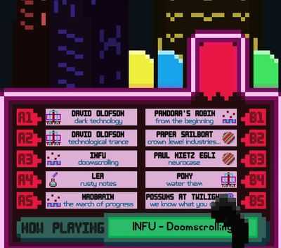 Эта игра была создана за 10 дней для OST Jam. Предполагалось, что это будет управленческая игра с золотом, которое можно заработать на клиентах, и песнями/вкладками, которые нужно разблокировать, но я снова перегнул палку... Так что это просто причудливый способ послушать песни из 2HAC - Volume 13