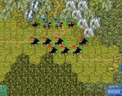 Карта с несколькими юнитами (тяжелая и легкая кавалерия, фургоны гуситской войны, , янычары). Вы можете выбирать юниты с помощью левой кнопки мыши. Вы можете двигаться или атаковать, щелкнув правой кнопкой мыши. Подсчитываются очки движения (но не дорожные бонусы). Рукопашная и баллистическая атака также работает. Когда у вас закончатся очки движения, нажмите «Завершить ход», чтобы восполнить очки движения.