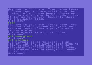 Lords of Time — это интерактивная художественная компьютерная игра, разработанная Сью Газзард и выпущенная компанией Level 9 Computing в 1983 году. Первоначально игра представляла собой чисто текстовое приключение для 8-битных микрокомпьютеров, но позже была выпущена как часть компиляции Time and Magik, в которой использовалась графика. были добавлены для всех версий дискет. Как и все приключения 9-го уровня того времени, оно было написано на собственном языке A-code, который не зависел от платформы — такая реализация виртуальной машины позволяла быстро портировать игру между платформами.