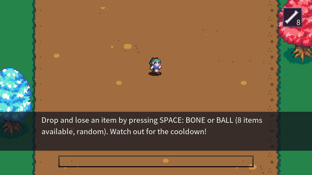 Бросьте и потеряйте предмет, нажав ПРОБЕЛ: КОСТЬ или ШАР (доступно 8 предметов, случайных). Следите за временем восстановления!