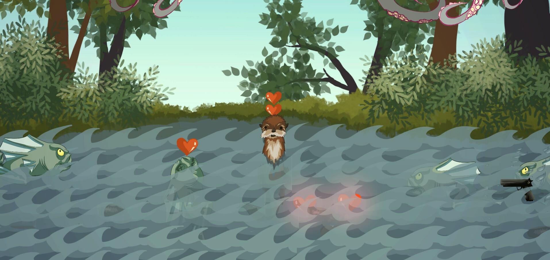 Используйте WASD и IJKL, чтобы использовать руки Отто Выдры, чтобы подбирать предметы, заряжать и стрелять из ружья, а также складывать сердечки, чтобы оттолкнуть Ктулху.