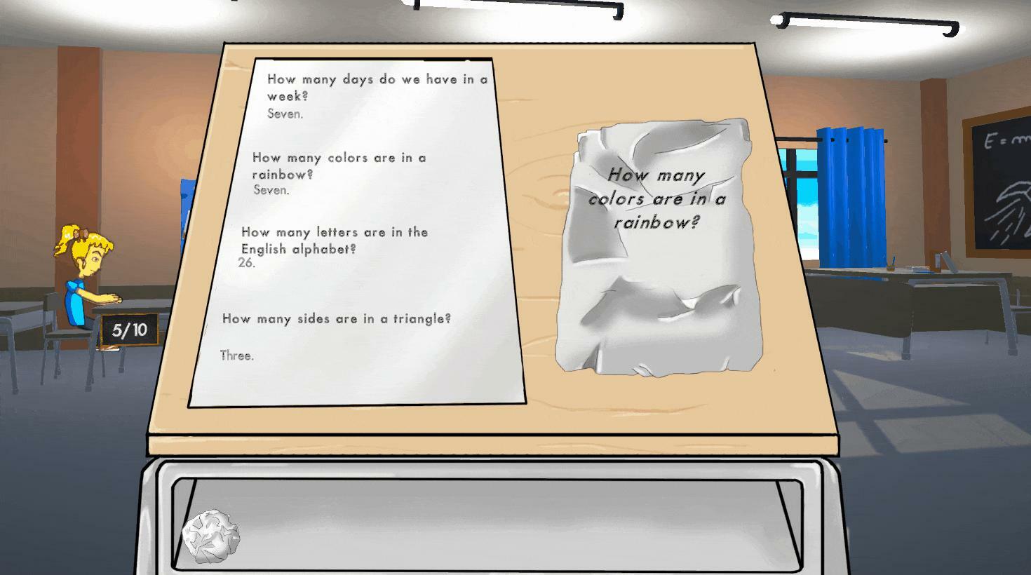 В этой игре вы возьмете под свой контроль классного ботаника в последние минуты обычного экзамена. Остальные одноклассники будут бросать вам бумажные шарики с просьбой помочь с некоторыми экзаменационными вопросами. Возьмите бумажные шарики, ответьте на вопросы и отправьте их обратно первоначальному владельцу, не заметив учителя. Если владелец получит бумажный шарик, его/ее экзаменационная квалификация улучшится, но если мяч будет перехвачен, будьте готовы к некоторому наказанию... Если одноклассник дойдет до точки, когда его/ее экзаменационная квалификация достигнет 0, тогда этот одноклассник Если вы оставите экзамен злым, то потеряете часть завтрака в качестве компенсации.