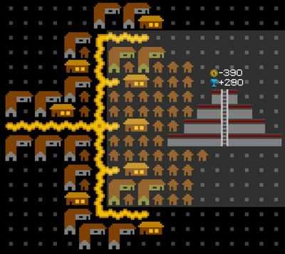 На валюту и ПО, которые вы зарабатываете за здание, влияют здания рядом с ним. Например, размещение дома рядом с магазином принесет вам больше валюты, чем размещение их далеко друг от друга. Однако размещение двух магазинов рядом друг с другом будет стоить вам больше валюты из-за конкуренции. Диапазон здания выделен белым цветом. Положительные взаимодействия между зданиями выделены зеленым цветом, смешанные взаимодействия — желтым, а отрицательные взаимодействия — красным. Над ним показано общее количество валюты и ПО, которое вы получите или потеряете, разместив здание.