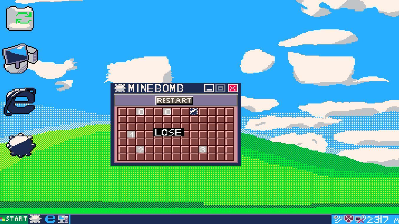 Симулятор операционной системы с функциональностью запуска игры, аналогичной Kmines. Цвета палитры ПИКО-8.