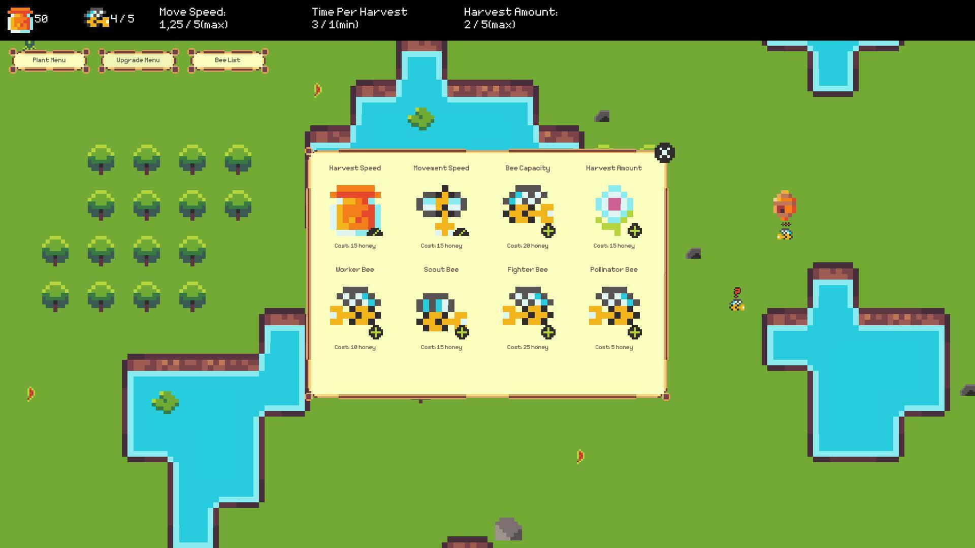 Используйте W/A/S/D или мышь для перемещения камеры по карте,и используйте колесо прокрутки для увеличения. Нажмите на улей или на кнопку сборки в верхнем левом углу, чтобы получить доступ к улучшениям и растениям.