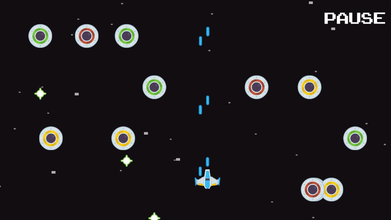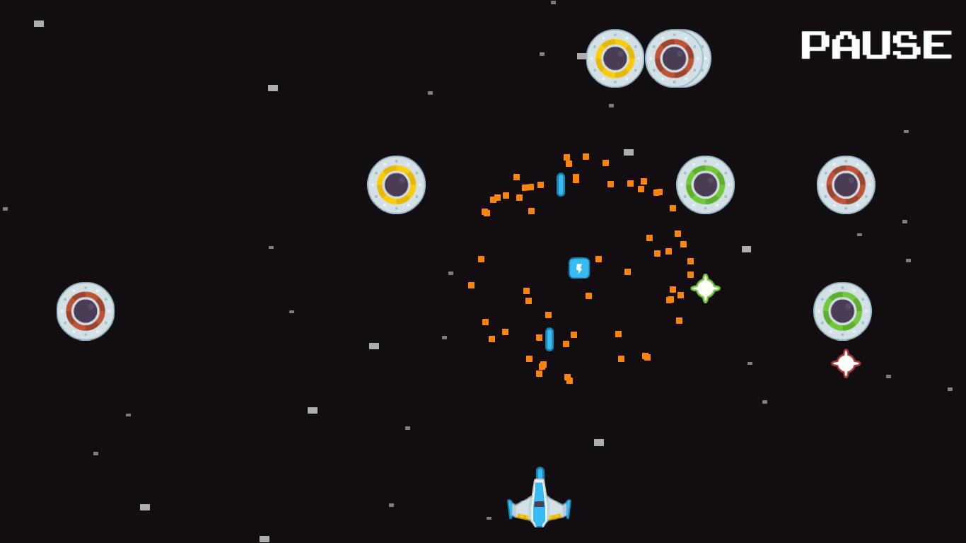 Игра в стиле космического шутера, которую я сделал для своего последнего задания по программированию игр. Игрок играет за космический корабль, который сбивает приближающиеся космические корабли пришельцев, чтобы заработать очки, уклоняясь от выпущенных ими пуль, а также получая улучшения атаки на протяжении всей игры.