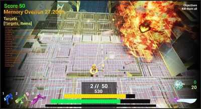 Стрелялка с двумя джойстиками сверху вниз. Находится внутри космической станции в комнате моделирования. Уничтожьте все цели, чтобы получить максимально возможный балл, не позволяя ИИ захватить пространство памяти симуляции.