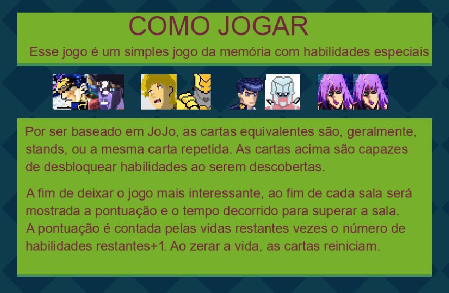 О, Jojogo da memória! это игра в жанре https://itch.io/jam/novajam(Jojojam)