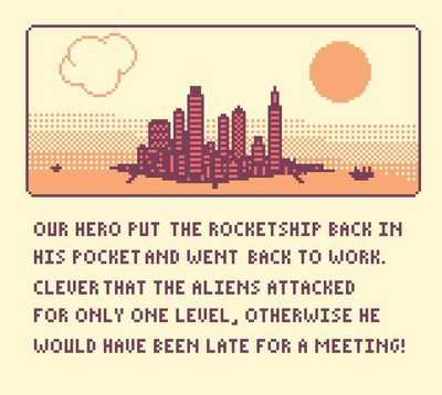 Наш герой идет на свое рабочее место, когда внезапно в город начинают вторгаться инопланетяне. Он быстро хватает сжимаемую ракету, которую держит в кармане, и поднимается в небо, чтобы спасти мир!