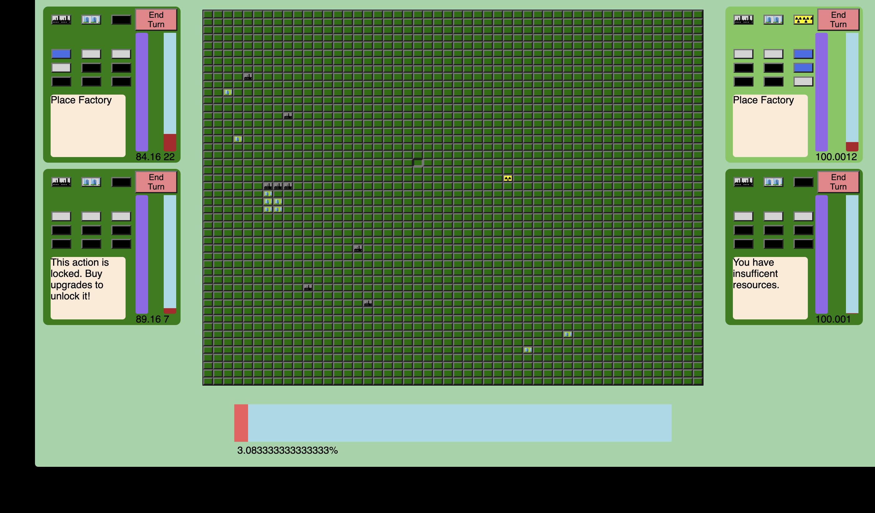 В каждый свой ход игрок может приобрести любое количество улучшений и до одного здания. Чтобы приобрести улучшение, нажмите на серые квадраты на своей карточке игрока. Карта игрока активного игрока окрашена светлее, чем карты других игроков. Чтобы купить здание, выберите здание, щелкнув его значок на своей карточке игрока, а затем щелкните квадрат на игровом поле, где вы хотите разместить это здание. Размещение здания завершает ваш ход. Если вы не хотите ставить здание в свой ход, вы можете завершить ход вручную, нажав кнопку «Завершить ход». Ресурсы генерируются в конце каждого цикла хода. Игра заканчивается, когда игрок достигает 150 очков материала (столбец справа от карты игрока) или когда полоса руин достигает 100%. Если полоса руин когда-либо заполняется, все игроки проигрывают игру.