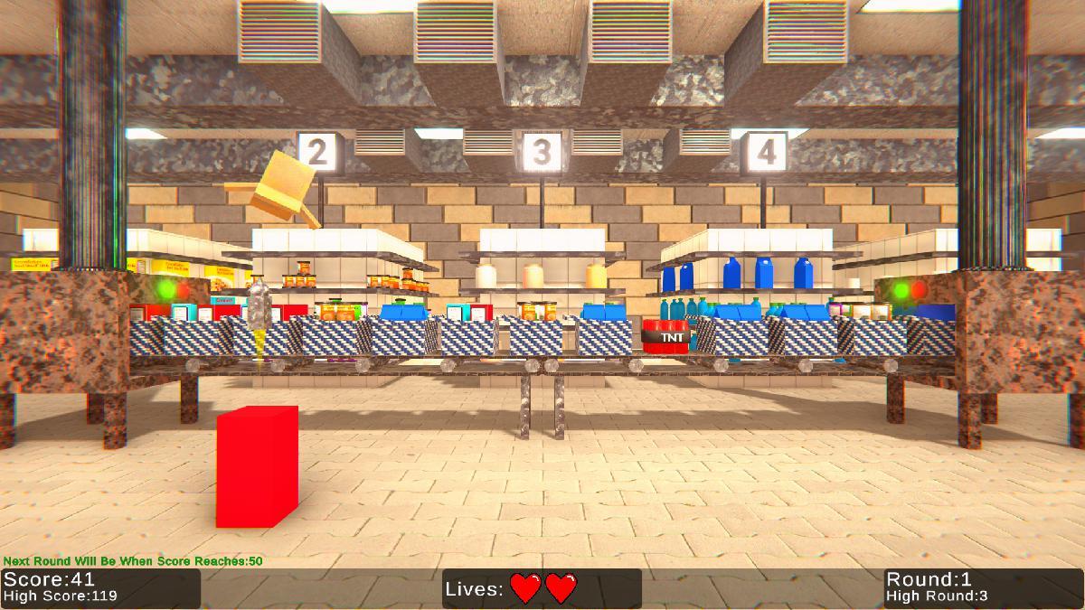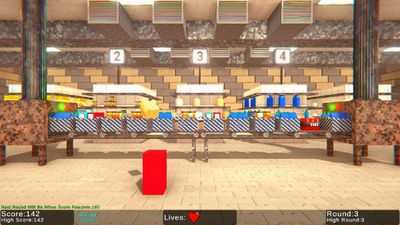 Добро пожаловать в рыночное безумие! Здесь вы играете за цветной куб, который работает в супермаркете и должен отслеживать поступающие поставки на конвейерной ленте и следить за тем, чтобы ни одна бомба или что-то в этом роде не смогло проложить себе путь! Тогда он должен снять его с конвейерной ленты!