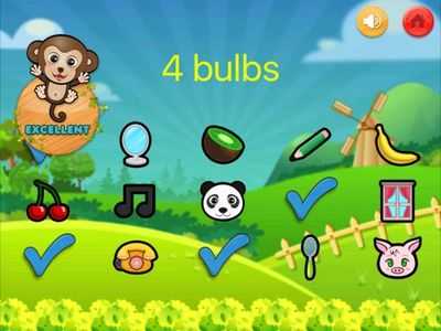 > Младший уровень: Прослушайте произношение объекта, узнайте необходимое количество мультяшных объектов с помощью такое же произношение, как и произнесенное> Старший уровень: Прослушайте произношение и написание английского слова, узнайте необходимое количество конкретного объекта, не нажимайте на другие несвязанные объекты