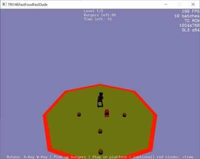 Управление: клавиши A и D для вращения. Возьмите все гамбургеры. Бургеры сделают вас быстрее. При желании возьмите красные часы, чтобы увеличить таймер. Оставайтесь на платформе, избегайте шипов