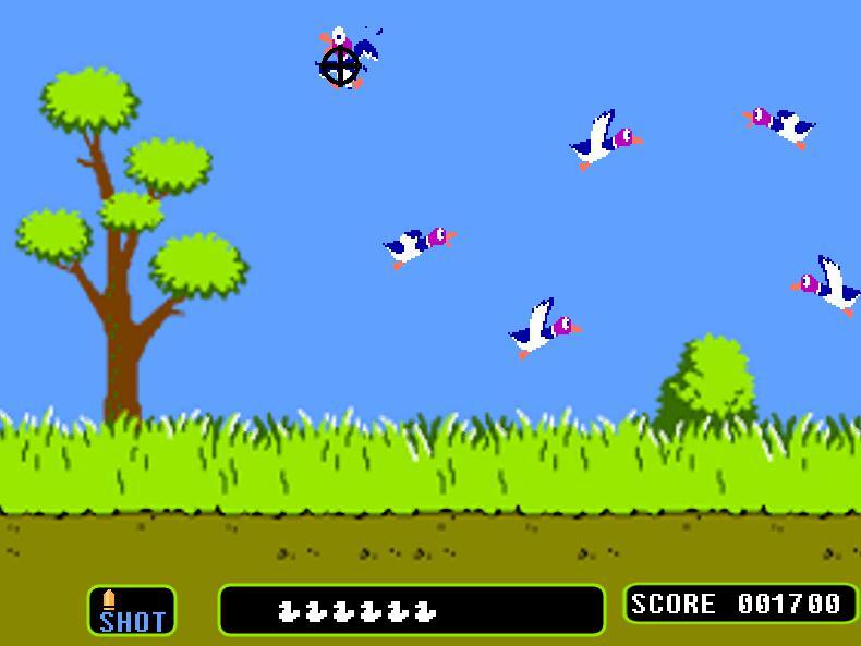 Простая версия классической игры для NES "Утиная охота" с высоким рейтингом, в которой у вас есть ограниченное количество жизней, которые истощаются каждый раз, когда утка убегает в верхнюю часть экрана.