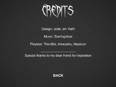 Особая благодарность Starlingoboe (@starlingoboe) за музыку к игре, нескольким тестировщикам за помощь в улучшении игры и моему другу за вдохновение.