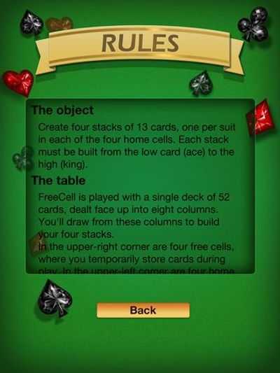 Цель состоит в том, чтобы создать четыре стопки по 13 карт, по одной масти, в каждой из четырех домашних ячеек.