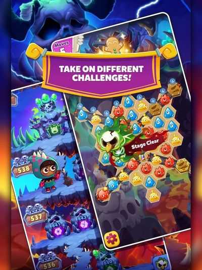 Создайте комбинацию, соединив 3 или больше монстров одного цвета друг к другу в 6 направлениях на досках, состоящих из шестиугольников. Вы даже можете делать перекрестные соединения, связывая уже соединенных монстров, чтобы получить Супер Бомбы на перекрестках!