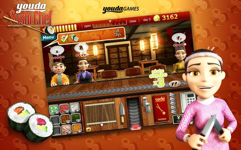 Предлагая своим клиентам все виды суши, ваша цель — достичь ежедневной цели. На каждом следующем уровне будет добавляться больше ингредиентов для суши, и тем сложнее будет приготовление суши. Чтобы достичь своей цели на более высоких уровнях, вы можете «купить» улучшения, составить комбо или подать еду на вынос. Чтобы сделать ваших клиентов еще более счастливыми, вы можете украсить свой ресторан, продемонстрировать отличные трюки с ножом или подать саке, пока они ждут. Это увлекательная игра в жанре тайм-менеджмент, уникальная в своем жанре. Youda Sushi Chef затмевает своим красивым дизайном и захватывающим геймплеем.