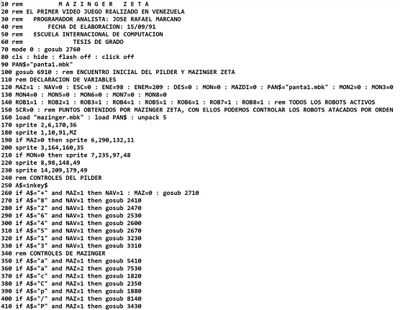 Я разработал эту игру для ATARI ST на движке STOS Creator, который был очень простым, скомпилированным с графическими процедурами для обработки спрайтов, растровых изображений и эффектов. Разработка не была завершена, потому что я переключился наCommodore AMIGA и поездка, которую я совершил в Венесуэлу в конце. С 2021 года я получил резервную копию этого и попросил помощи в твиттере, чтобы перенести ее на дискету в формате ST, и Джорди из @ataristfan любезно помог мне в этом. быть в состоянии выполнить его в emu. Итак, здесь я оставляю как исходное одобрение, так и список исходного кода, чтобы, если кто-то в сообществе захотел использовать его, он был свободен от него, не хватало подпрограмм ИИ для врагов (поскольку я играл только со своими братьями , я оставил управление роботами с джойстика 1, хе-хе) и блокировки по координатам, чтобы Мазингер и Пилдер не ушли с экрана, навыки, которые я очень хорошо освоил впоследствии, но которые в свои 19 лет я их не достиг очень хорошо.