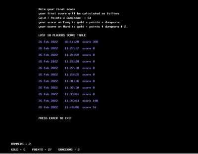 Традиционный текстовый и клавиатурный рогалик с необычной механикой, в которой движутся стены подземелья. вы пытаетесь собрать золото и оружие и пытаетесь не попасть в ловушку. последние 10 игр сохраняются, так что вы можете бороться с высокими баллами. есть легкая, сложная и обычная версия.