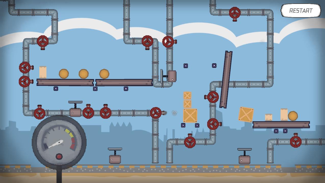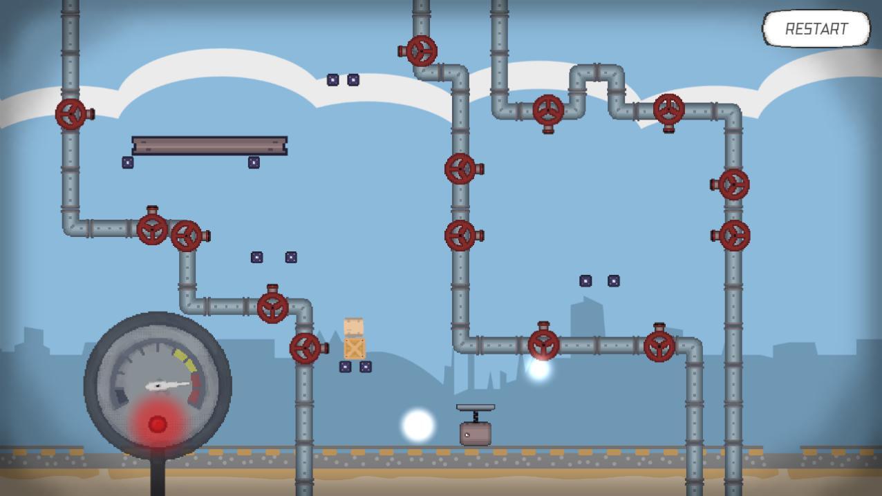 Нажмите на клапаны, чтобы сбросить давление и взорвать все объекты на землю. Стучите предметами по насосам, чтобы поддерживать давление. Если давление поднимется слишком сильно, трубы взорвутся, а если давление упадет слишком низко, вы выдохнетесь! Чтобы победить, пройдите все пять уровней.