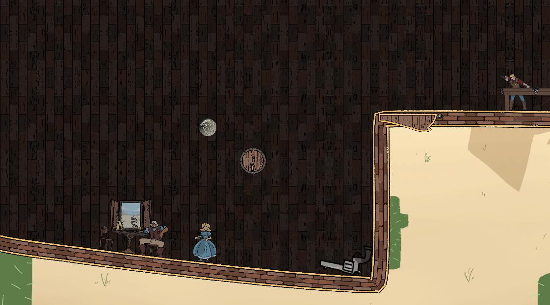 Tilted Saloon — платформер, созданный для Ludum Dare 50. В этом проекте перекати-поле катится и подпрыгивает вокруг Tilted Saloon, и вам нужно использовать распашные двери, чтобы направить его к концу салона. где он сможет безопасно вернуться в пустыню, а не… просто упасть куда-нибудь в пустыню, я думаю?