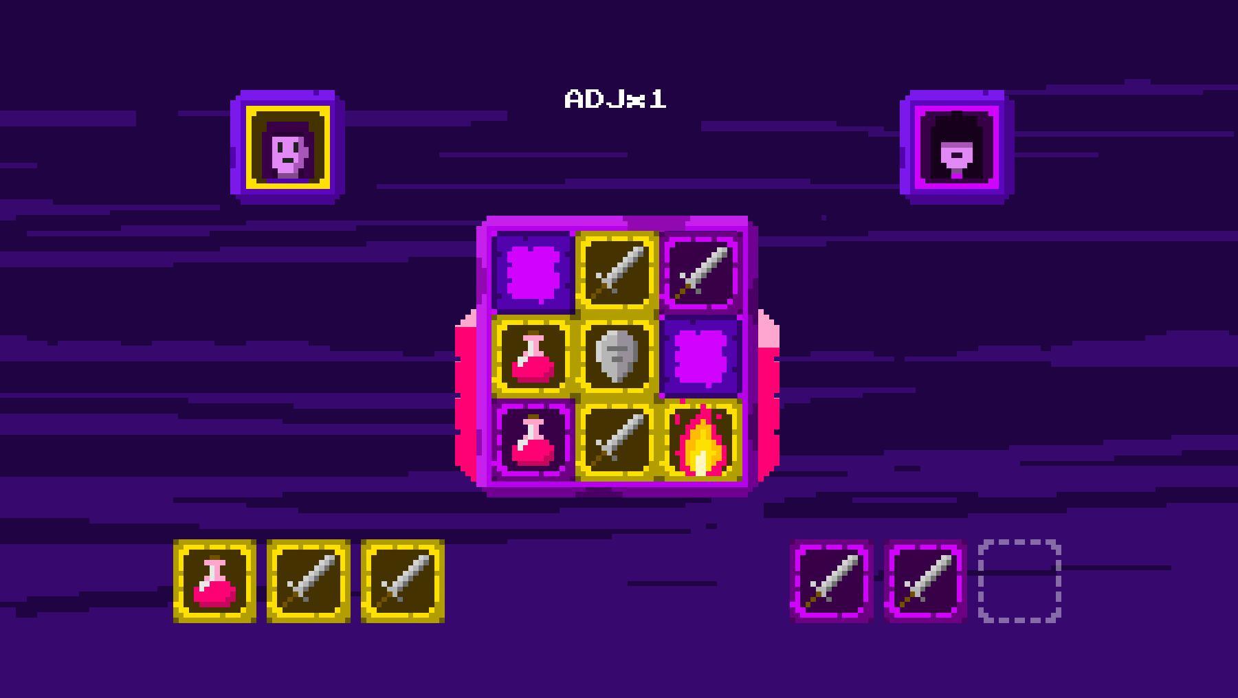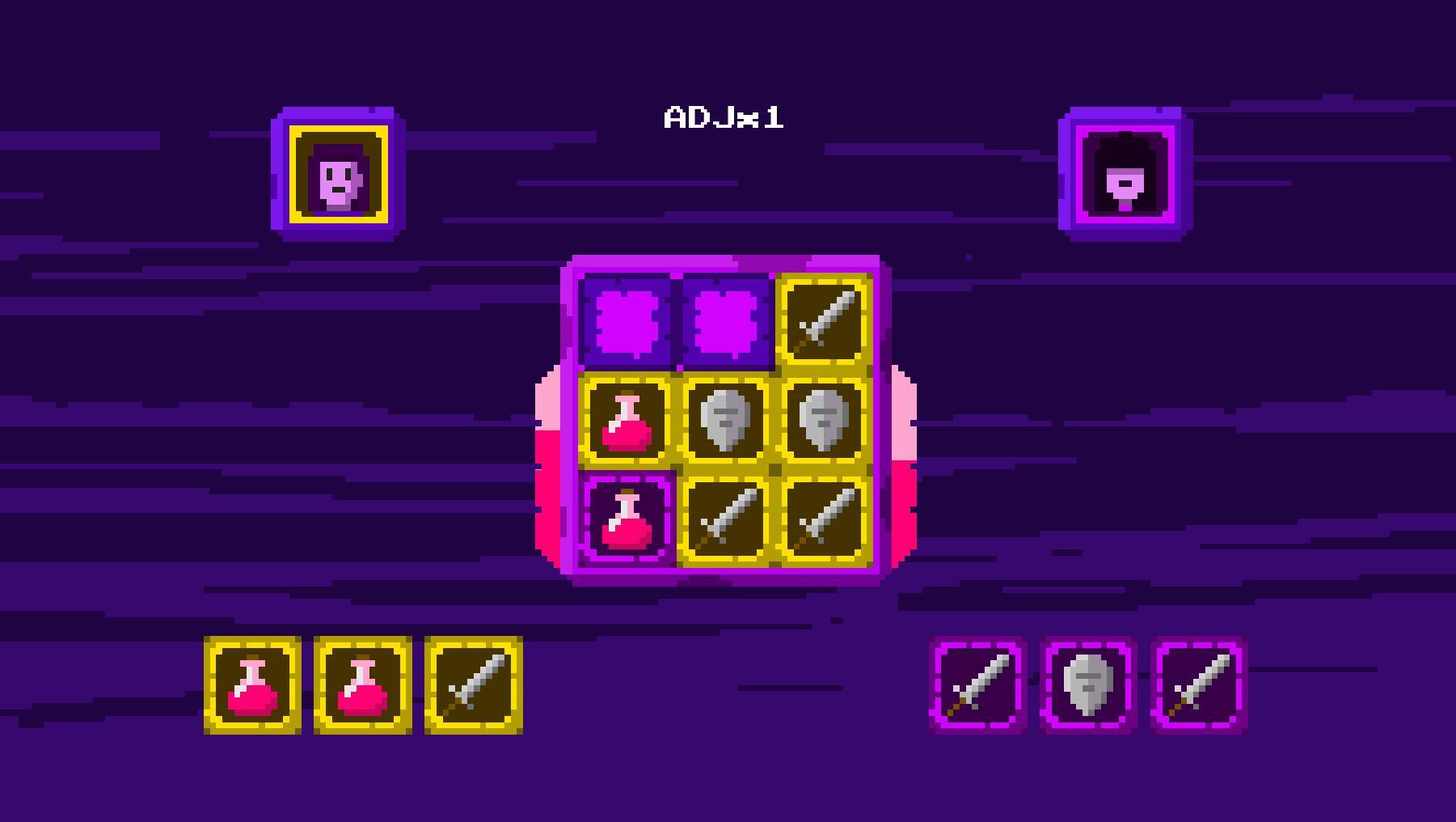 Вы перемещаете желтые плитки. Существует 3 разных типа плитки. Меч, щит и здоровье. Цель – победить врага. Вы делаете это, размещая плитки на доске. Как только две или более плитки одного типа окажутся рядом друг с другом, вы можете щелкнуть по ним, и произойдет действие. Если на плитке изображен меч, враг будет атакован, щит, и значение вашего щита увеличится, здоровье и значение вашего здоровья увеличится. Ценность действия определяется конфигурацией плиток. Чем больше плиток способствуют определенному действию, тем мощнее это действие. Например, две плитки имеют значение 2. Три плитки в горизонтальном или вертикальном ряду имеют значение 5.