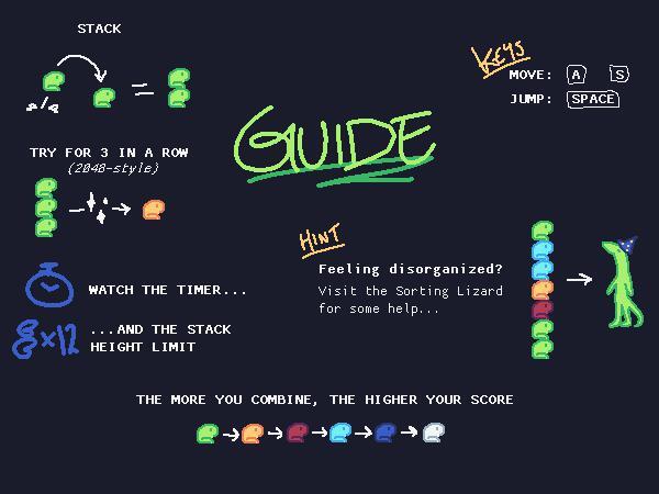 Frog Stack – это небольшая игра-головоломка о скоплениях лягушек. Запрыгните на лягушку, чтобы сложить их. Попробуйте три одинаковых цвета подряд, чтобы обновить их (стиль 2048). Если ваш стек становится слишком неорганизованным, попробуйте обратиться за помощью к Sorting Lizard. Наконец, следите за таймером и высотой стека!