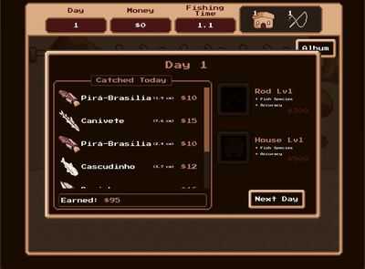 - После того, как время рыбалки закончится, вернитесь к себе домой, чтобы продать свою прибыль, купить новое снаряжение и поспать до следующего дня рыбалки.